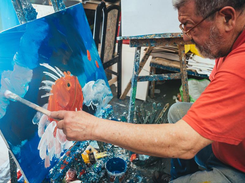 Kada ne stvara nova likovna djela – a svakoga dana naslika i desetak novih slika - akademski slikar opušta se uz sviranje violine ili „ćakulu“ s posjetiteljima njegovog „umjetničkog carstva“, koje će rado uputiti u zanimljive anegdote umjetničke karijere duge više od pola stoljeća, tijekom koje je izlagao i sa slavnom Yoko Ono i obarao mnoge izazovne rekorde.