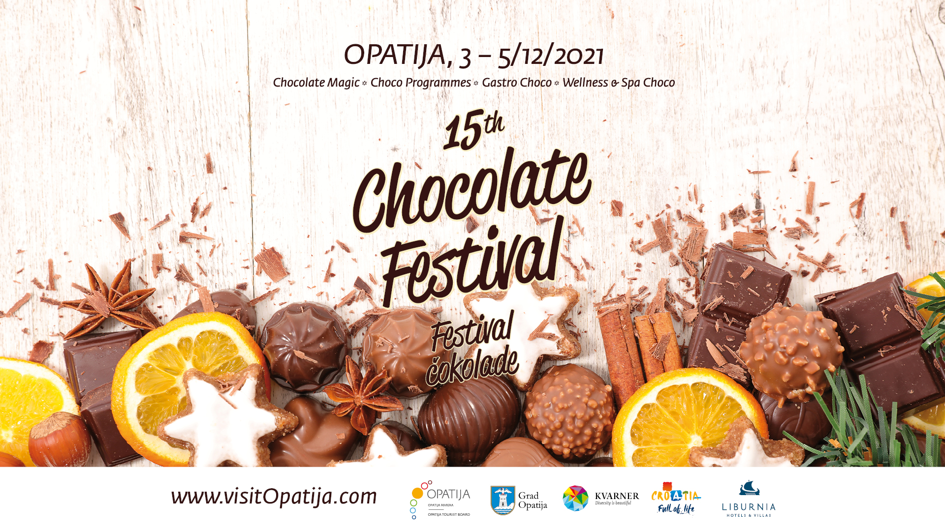 Šećer na kraju godine Opatiji će donijeti novo izdanje Festivala čokolade. Bajkovita atmosfera adventski raskošno uređenog grada bit će sjajna kulisa za vrhunske slastice koje će se, ekskluzivno za 15. Festival čokolade, vratiti u Kristalnu dvoranu hotela Kvarner. Svečana prigoda zahtijeva i svečani ambijent, pa će se tako jubilej najslađe opatijske manifestacije proslaviti pod slavnim kristalnim lusterima najstarijeg hrvatskog hotela.